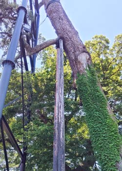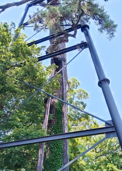 樹齢400年の巨松。鉄骨や木材でサポートされて頑張っている。